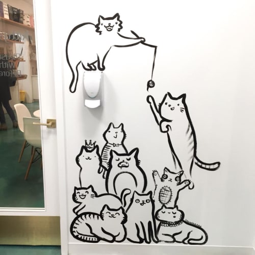 a bunch of cats wall mural and chalkboard art by artist rozzie lee seen at regal cat cafe calgary wescover