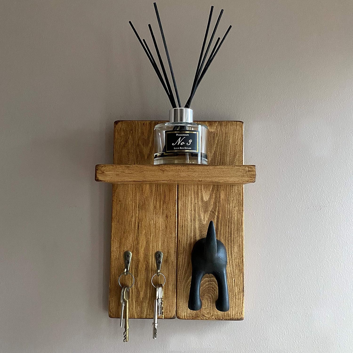 handmade rustic wood wall hanging dog lead holder key rack with shelf tail hook in an oak wax finish amazon co uk handmade products