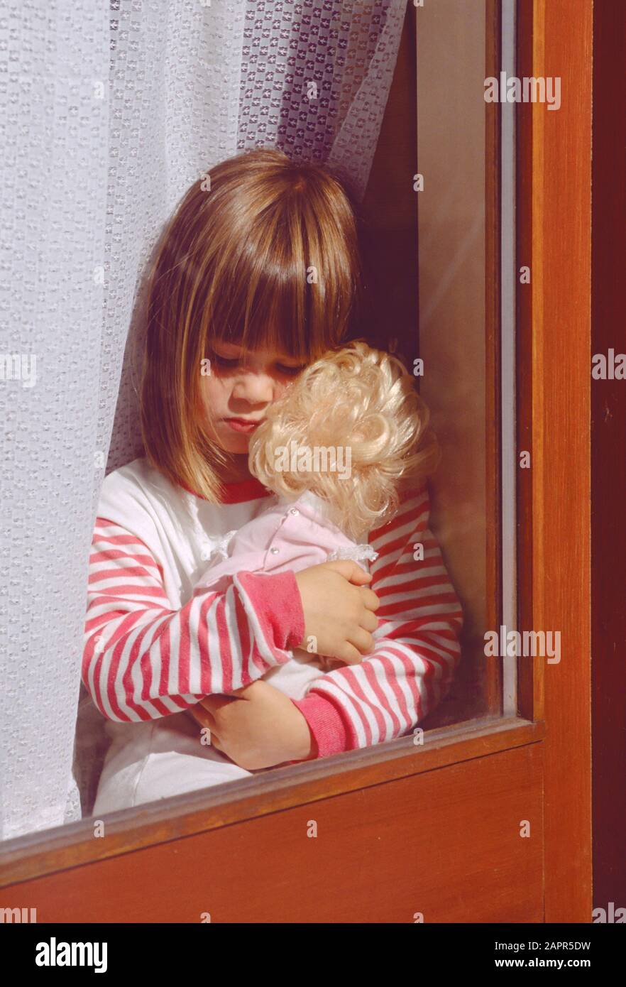 little girl crouched on the floor beside a patio door looking unhappy cuddling a doll seen from outside stock photo alamy