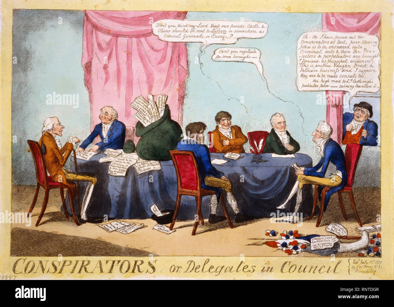 cartoon shows three government ministers viscount sidmouth thomas reynolds and viscount castlereagh sitting at a table with three agents or spies stock photo alamy